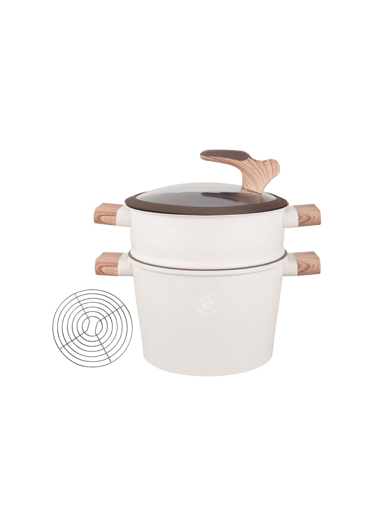 Elevate your culinary experience with the Royal Swiss 6.5L Couscous Pot, expertly designed to combine functionality and style. Available in two elegant finishes—black with dark wood handles and beige with light wood handles—this pot offers both beauty and versatility for your kitchen.